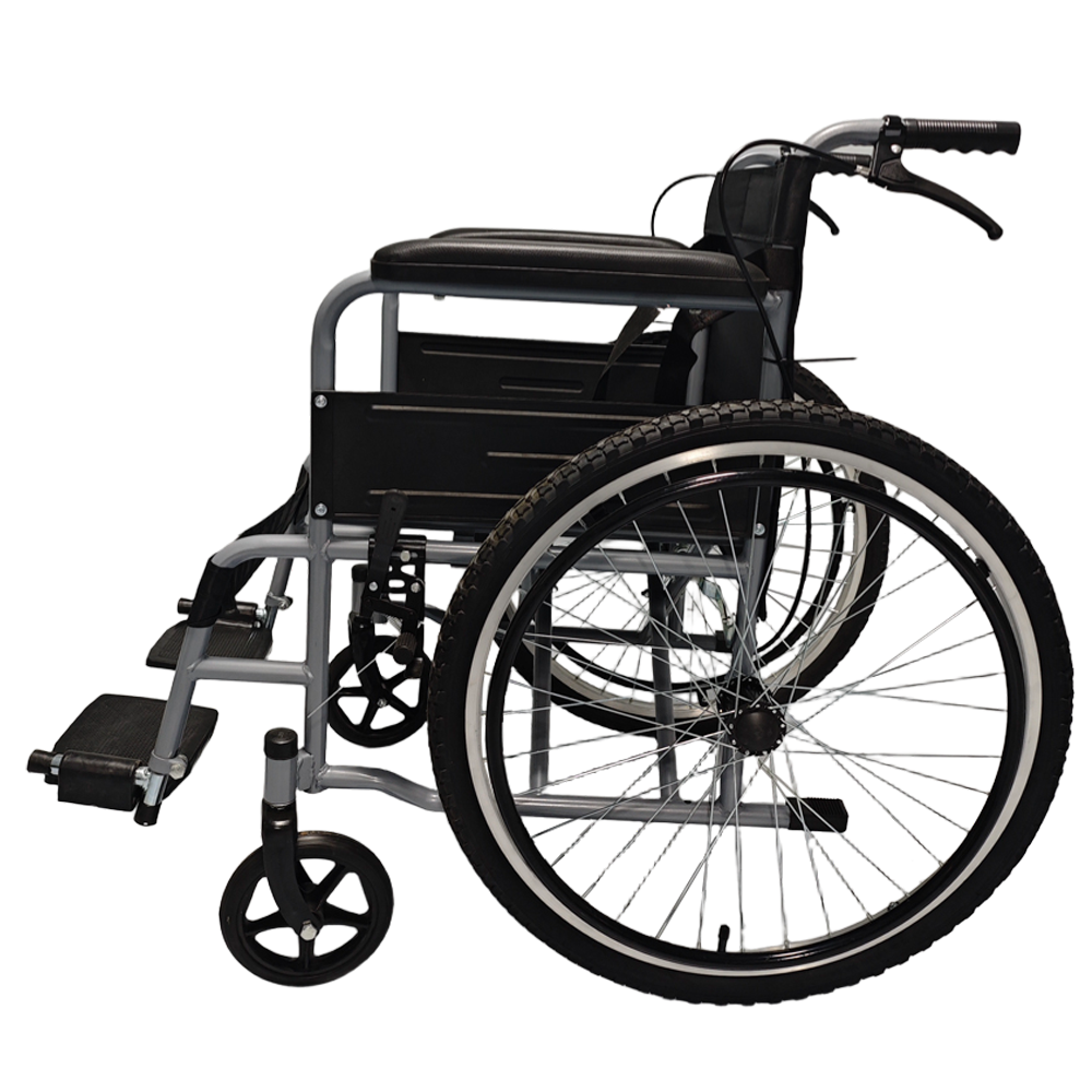 All-Terrain Wheelchair with Baking Paint Carbon Steel Frame. Oxford Cloth Seating & PU Leather Armrests. Air Tires for Rough Terrain. Metal Handwheel & Dual Brakes. Adventure-Ready Mobility.