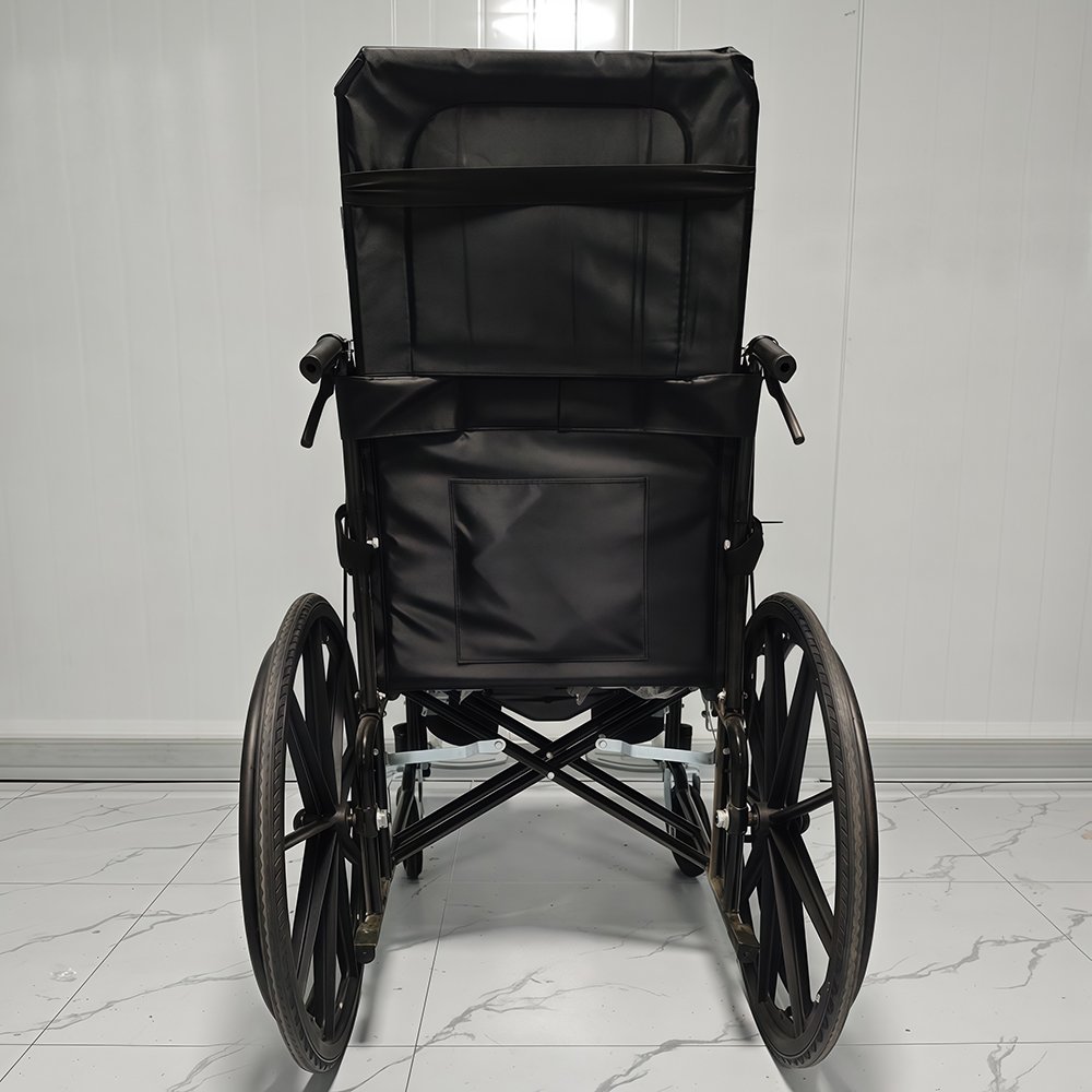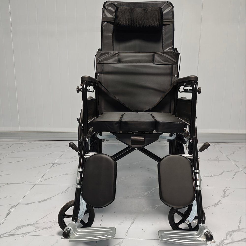Fully Reclining Commode Wheelchair with Baking Paint Finish. Oxford Cloth Seating & Adjustable Legrests. PVC Armrests & Iron Foot Pedals. Reliable for All-Day Use.