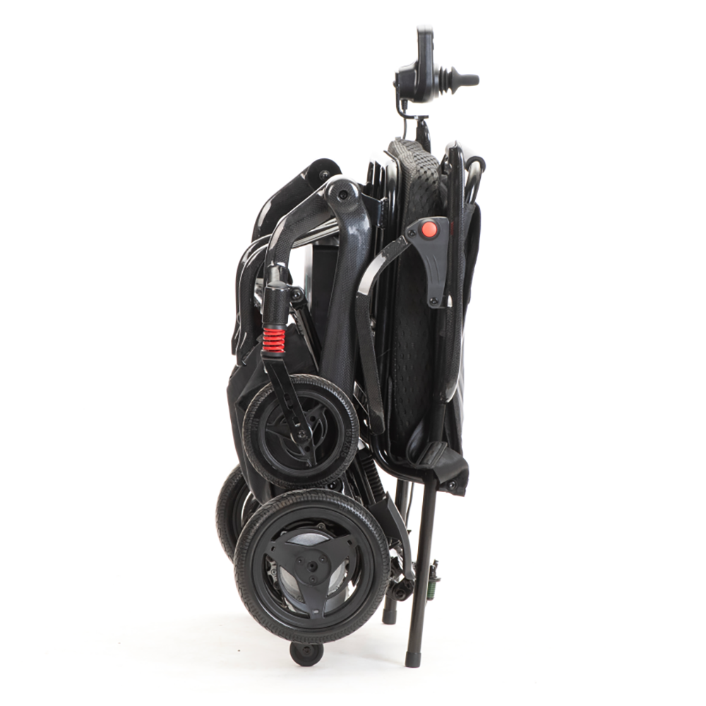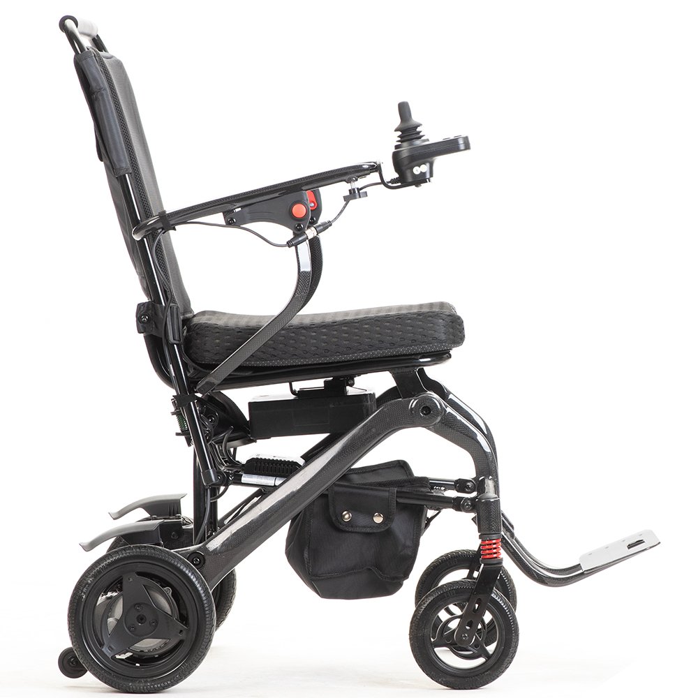 A Lightweight Carbon Fibre Electric Wheelchair, this model is ultra-portable—easy to carry and transport for travel. Its Foldable design (half carbon fibre, half aluminum frame) saves storage space, while the baking paint finish adds durability. Breathable sponge-oxford cushion/backrest keeps users comfortable, and a PU Leather Pedal is easy to clean. Dual 500W motors deliver power for climbing, and the 360° waterproof rocker controller resists interference. Rear anti-tilt wheels enhance safety, Liftable Armrests simplify transfers, and solid tires (black) offer traction. Manual/electric dual modes add flexibility, and Shock Absorbing front wheels smooth rides. Perfect for users prioritizing carbon fibre’s lightweight strength, it balances portability and functionality.